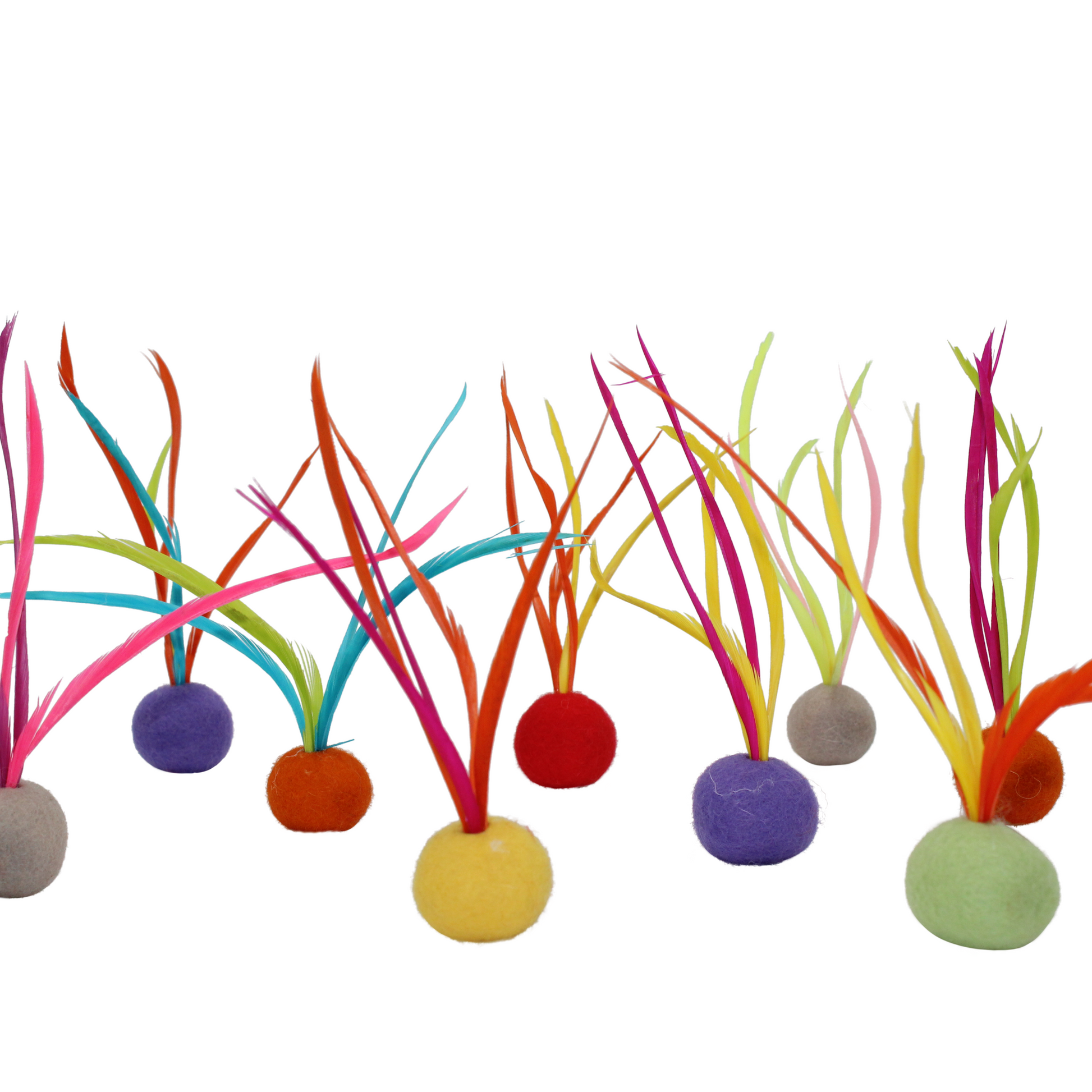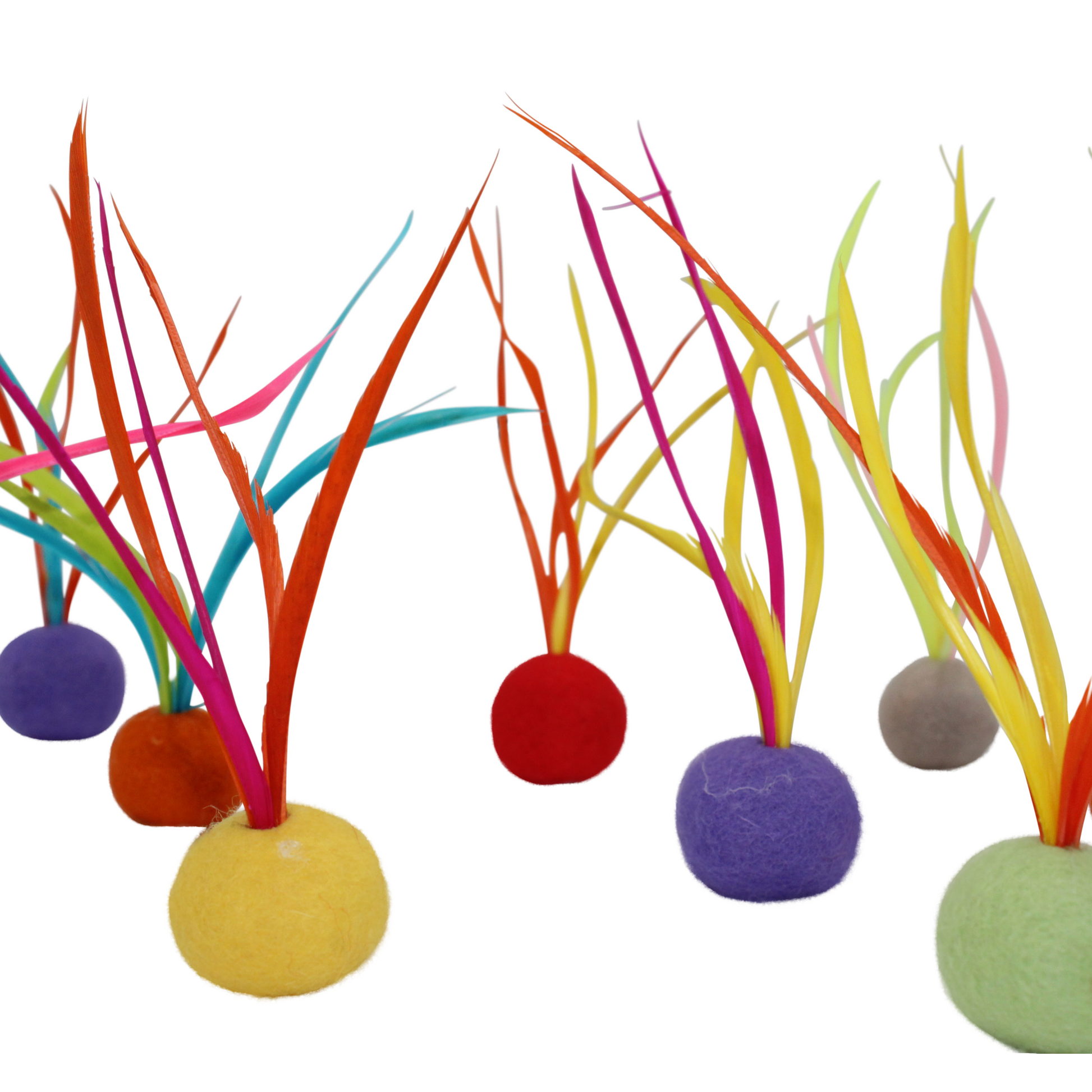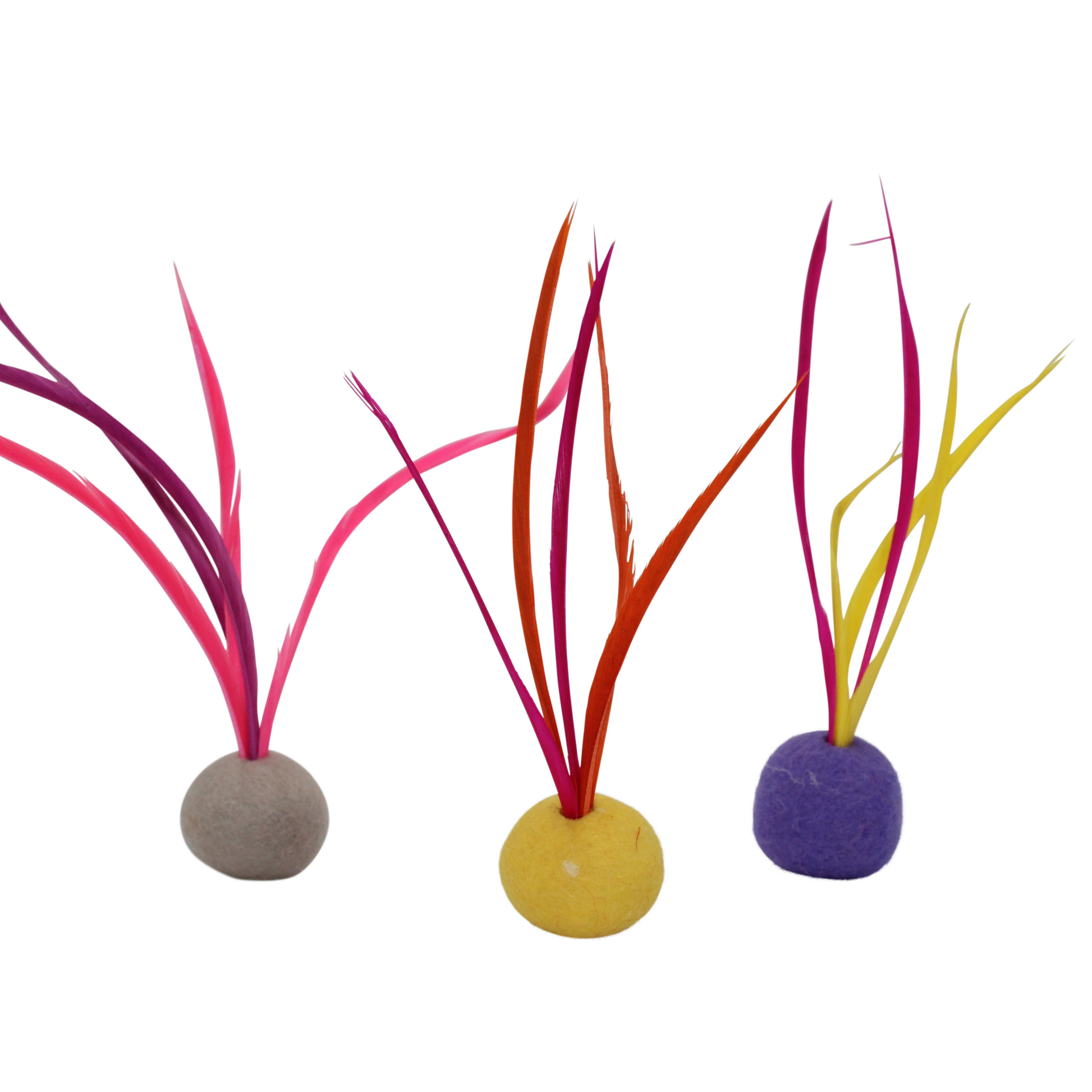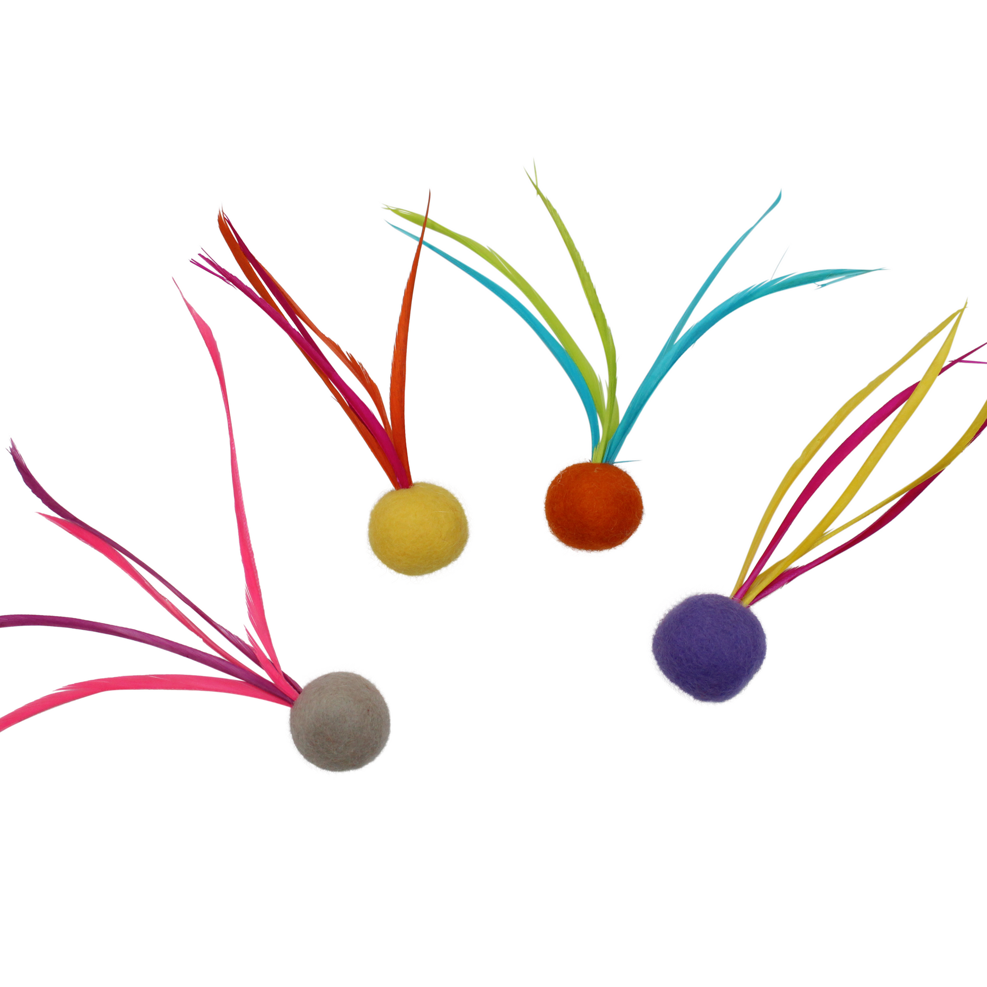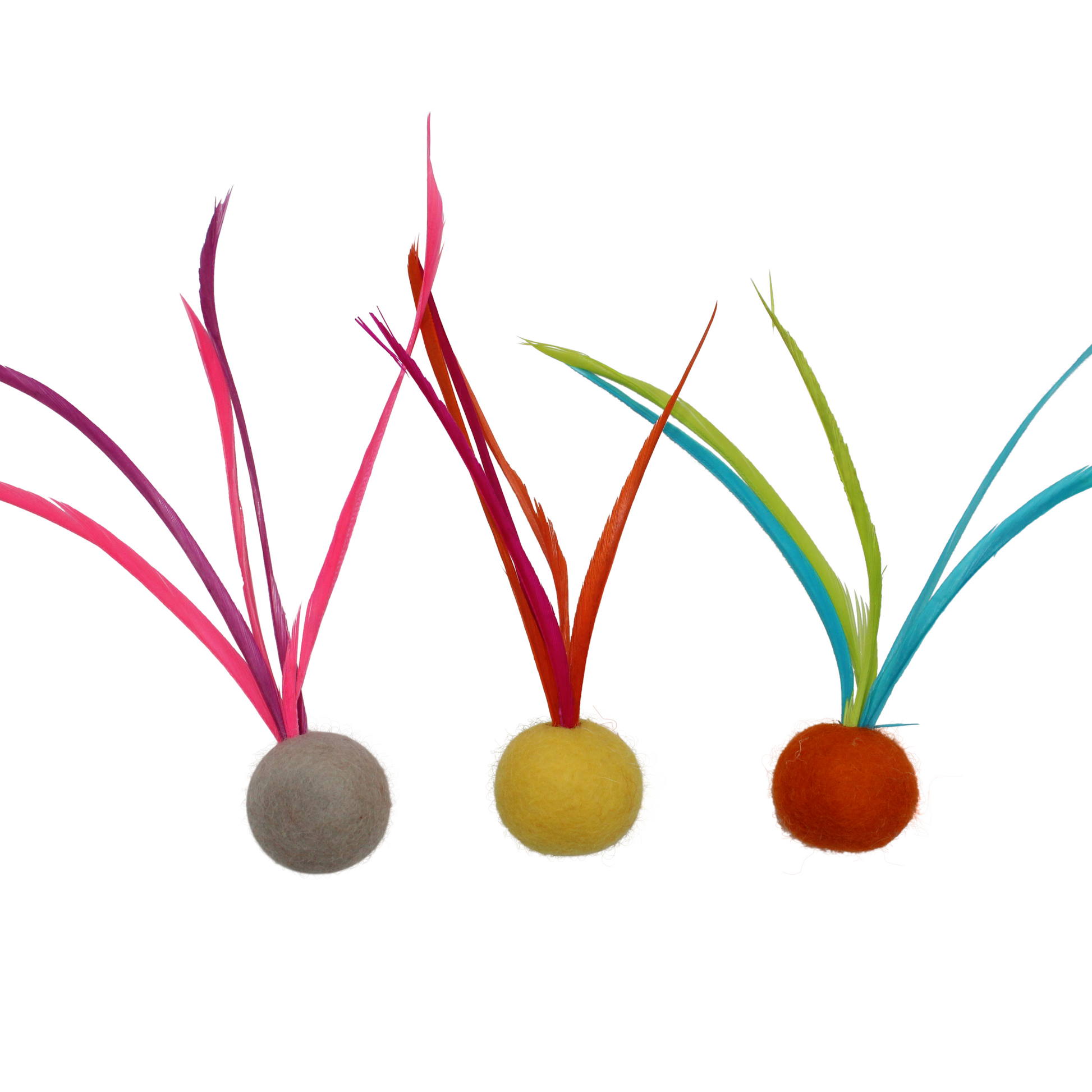 These handmade Feather Cat Toys are made with Goose Biot feathers and measure approximately 5 inches long and around 3 inches wide. The ball is made out of solid felt and measures just under 1 inch in diameter (25mm). Each package includes a variety of colored felt balls.